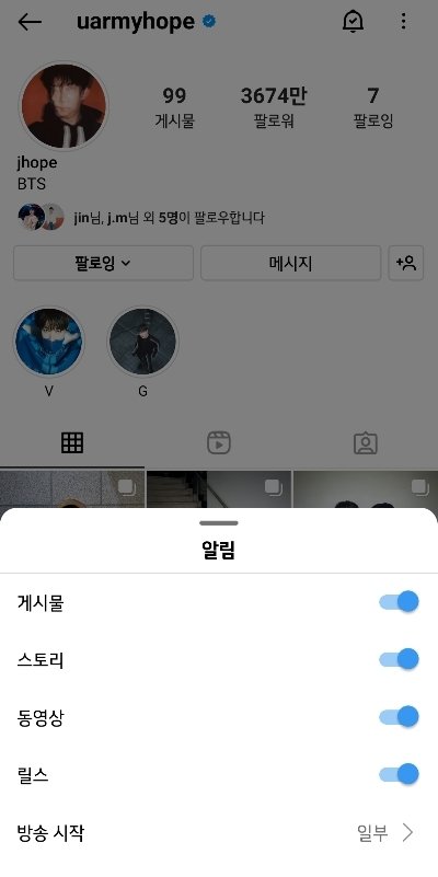 이거 알람 받고싶은 사람의 계정페이지에 있는 우측상단 종표시에 알람 설정하는거 맞지?