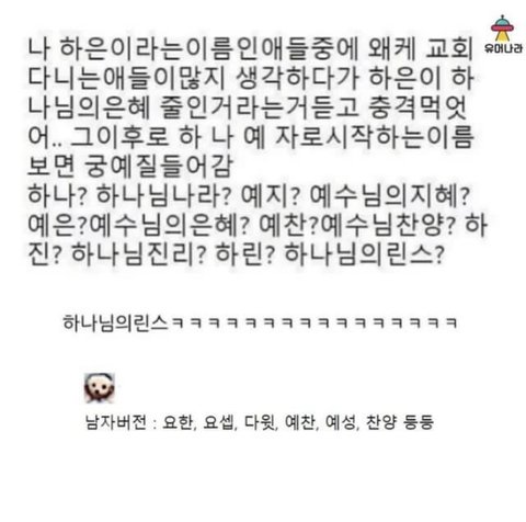 근데 ㄹㅇ교회다니는 집안 애들 이름 ㅇㄱㄹㅇ임