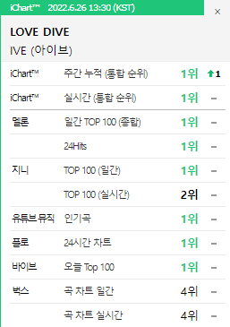 6월 26일 13시 30분 기준 국내 주요 음원사이트 실시간 기록