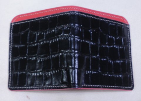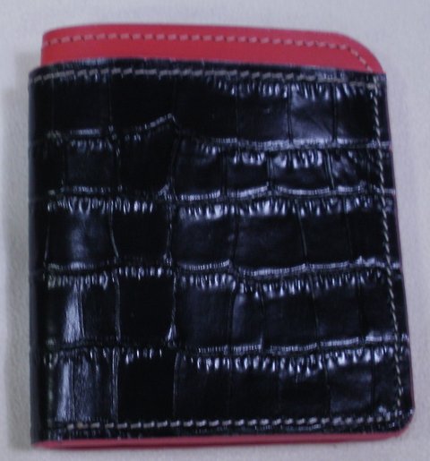 악어 무늬 엠보 블랙 컬러 가죽과 민무늬 레드,브라운 컬러 가죽을 콜라보하여 제작한 지폐 지갑입니다.(마디샤)