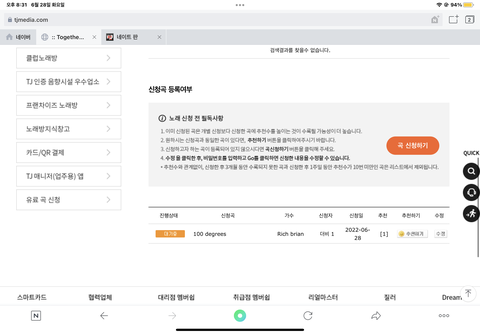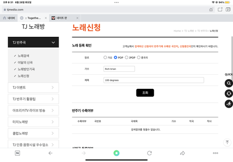 tj 노래 신청 네이버에 쳐서 저렇게 입력하면 내가 올려놓은 거 떠!