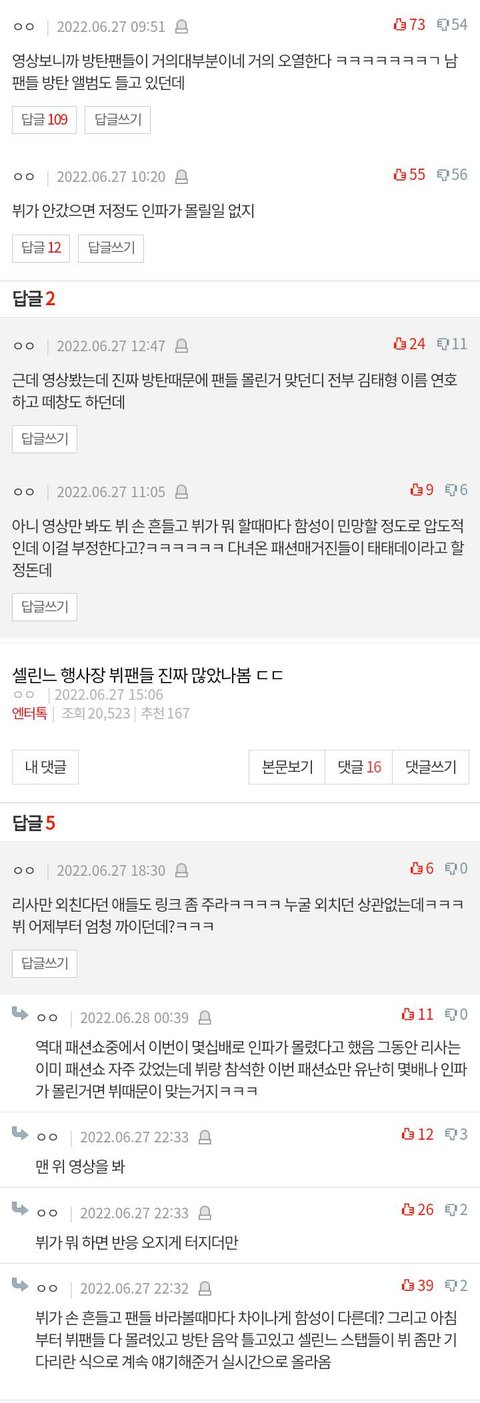 (화질 구림 주의) 그리고 이번에 박보검 뷔랑 같이 간 셀린느 쇼ㅇㅇ당연히 세계적인 스타 방탄 중에서도 인기멤인 뷔에 비하진 못하겠지만 리사 보러 온 팬들도 엄청 많았고 혼자 갔어도 19년 인파보다 훨씬 더 많아졌을거임. 영상은 첨부 안 되는데 소리 들어보면 리사 이름 떼창하고 리사도 감동 먹은 표정임