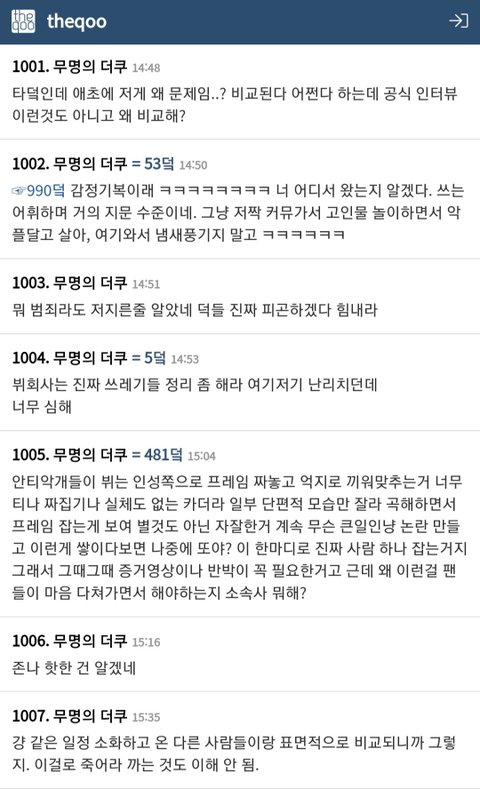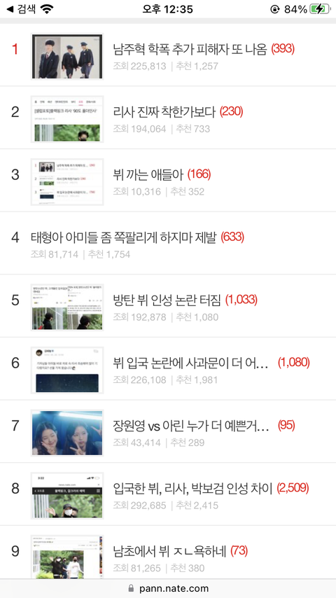 이 상황이 자연스러워 보이는 사람 없을걸? 지금 순식간에 추천수 올라가고 비슷한 까글 도배되는거 아이디 몇십개씩 만들어서 조직적으로 몰려오는 악개들때문이지 (여기에 이런 남욕먹는거 신나하는 정병들도 참전한 것 같고) 다른 커뮤에서는 같은 그룹 ㅇㅇ악개 지들이 한거 자랑스럽게 얘기도 하던데? 우리가 이정도로 머릿수 많고 힘있다고(어이없음) 질투심과 열등감에 미처버린 분들이 계셔서 그럼