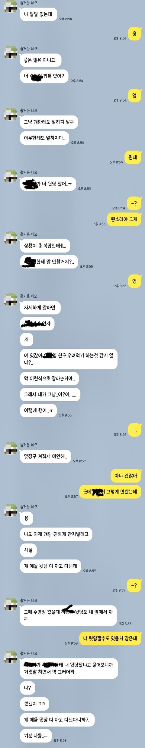 걔가 갑자기 근데 사실 여기에 있어 라는거야 그래서 아… 나구나 그렇겟지? 이생각인데 친구가 나보고 친구 두명이 뒷담을 깟다는거야 그래서 울뻔햇어