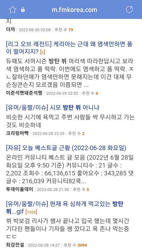 판 뿐만 아니쥬? 오만 여초 남초 커뮤에 비슷한 제목으로 뷔 까글 도배