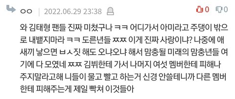 방탄에 뷔가 있는게 너무너무 싫음.......!! 근데 맘충이니 뭐니 여혐도 곁들였네 조카 가지가지 ㅅㅂ