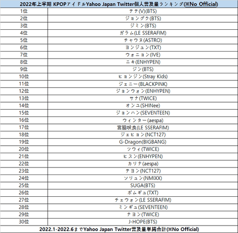 2022년 상반기 일본 트위터 케이팝 아이돌 개인 언급량 순위(공식 아닌 1월부터 6월까지 버즈 단순합계)
