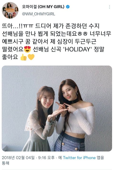 수지 자기 친분과시 이런거 티 안내던데 아린은 누가봐도 진심이라ㅋㅋ수지도 예뻐하는것 같더라
