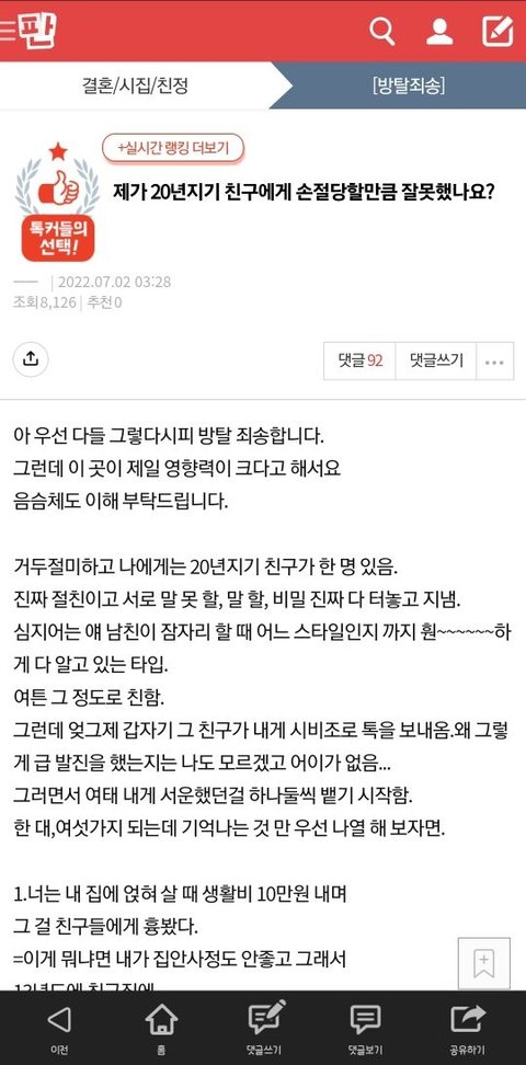 제가 20년 지기 친구에게 손절당할 만큼 잘못했나요?