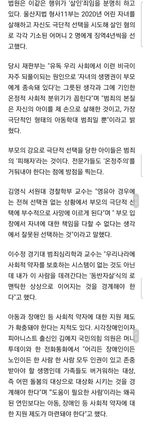 진짜 동반자살이란 단어는 이런 경우에 쓰면 안된다고 생각함. 각각 성인이 모여서 하는 거면 몰라도... 이건 그냥 비속살해지... 애만 안타깝다 진짜...