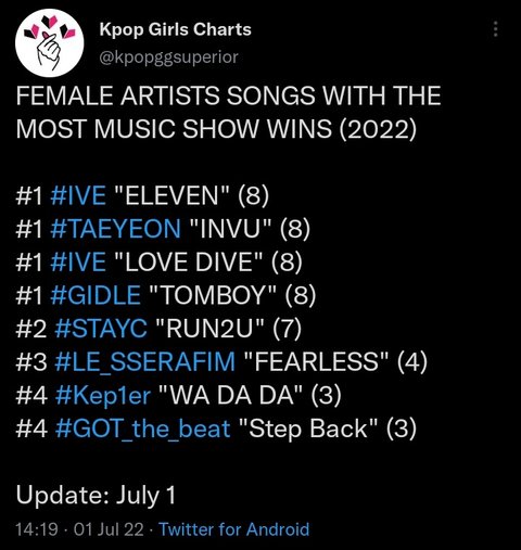 인가까지 총 9관왕으로 2022년 여돌 최다 음방수상 기록이라고함