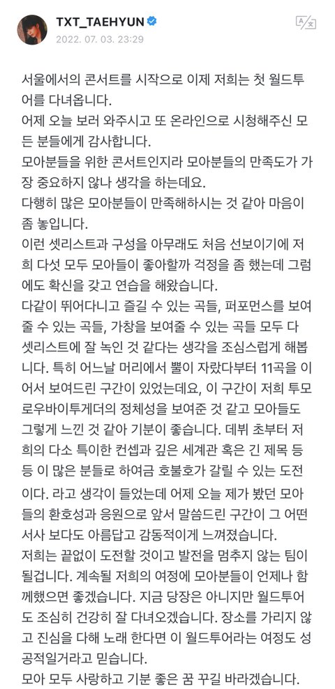첫 오프라인 콘서트 한국에서 끝나고 위버스 와서 쓴 글임