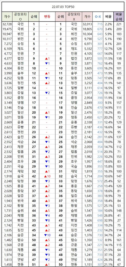 남돌 열팀 통합 포타 순위 2022.07.03