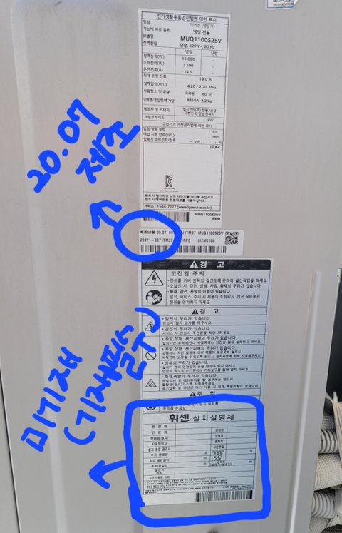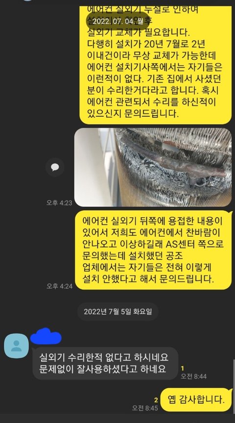 *사진은 실외기 필터같은 부분 용접자국 및 실외기 스티커 사진입니다. 20년 7월 제조 및 설치실명제 미기재 확인이 가능하지요. 마지막 사진은 전 매매 집주인분측 과 주고받은 카톡입니다. 작년엔 아무 문제 없었대요. 아마 설치할 때 용접 후 가스충전까지 해 둔 듯 합니다.