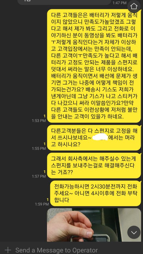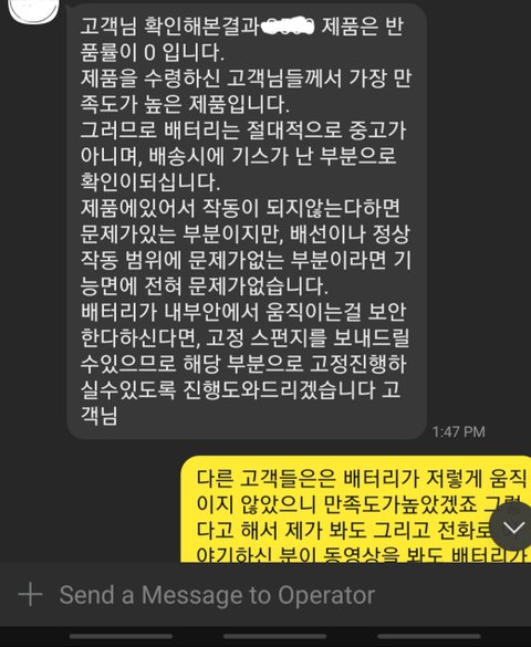 답변은 다른 고객분들은 100프로만족하는 제품이고 환불이 0프로 되는 제품이기에 회사에서 배터리를 고정할수있는 스티프로폼을 보내준다게 다였습니다.