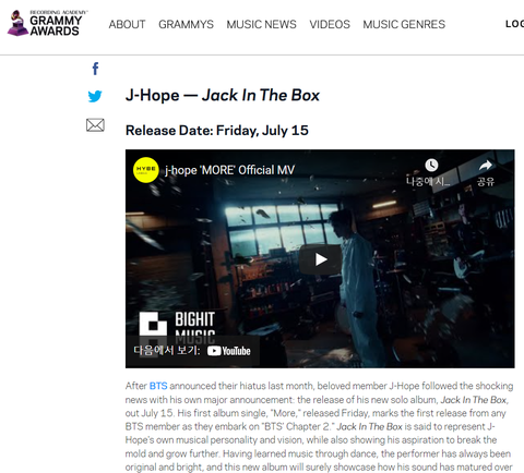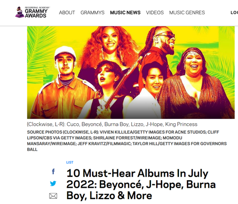 그래미 홈페이지 가보니까 2022년 7월 반드시 들어야할 앨범10에 제이홉 잭인더박스 선정됐대! 그래미가 호비언급하네