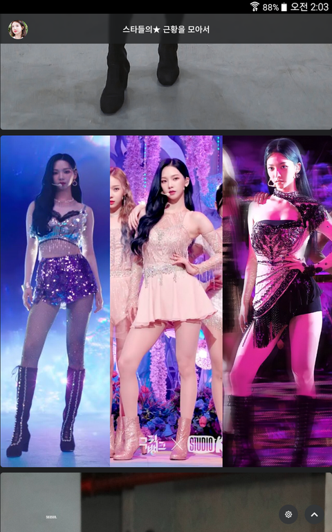 허리선 짧아보이게 하이웨스트 옷을 입고 짧은 종아리 커버를 위해 롱부츠 신은 경우가 많음