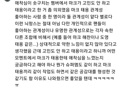 애착심이 솟구치는 멤버로 고민도 안하고 태용 골랐던 거 좀 의외라고 생각했었는데 태용 롤페보고 납득감 작사나 작곡같은 음악적 활동할 때 서로 상의하는 그런 모먼트처럼 멤버 개별의 관계성을 떠나서 비즈니스적으로 서로 의지하는 관계같음 그래서 그런지 서로 속을 터놓고 이야기 한다했을 때 둘이 참 서로를 믿고 많이 의지하는구나 새삼 다시 느끼게 됨 ㅋㅋㅋㅋㅋㅋ