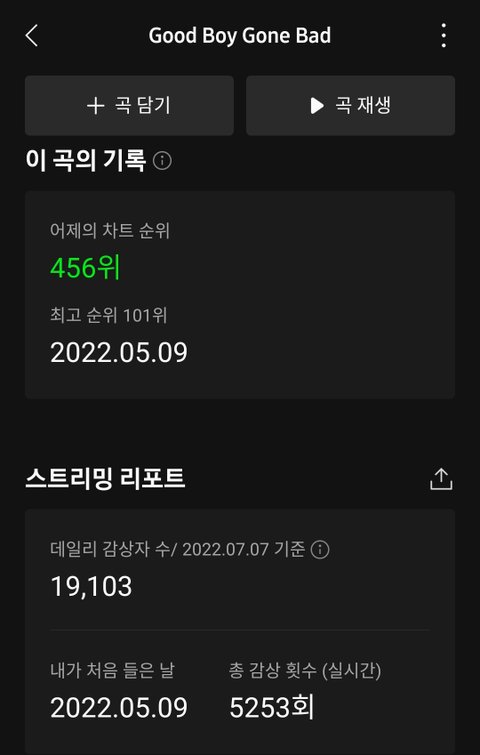 언젠간 일간도 높은 순위 기록하고 장기집권(?하는날 오면 좋겠다 이번 컴백때 일간 딱 1위 차위로 못들어서 아쉬웠는데 매컴백마다 오르고 있으니 다음컴백 기대중 943도 900위대야 역시 킹사삼 모아라서가 아니고 투바투 노래맛집인듯