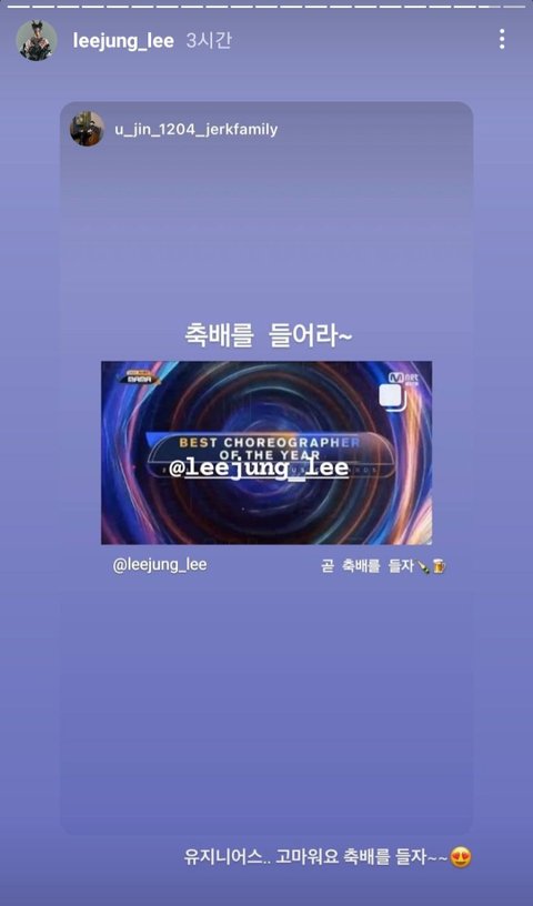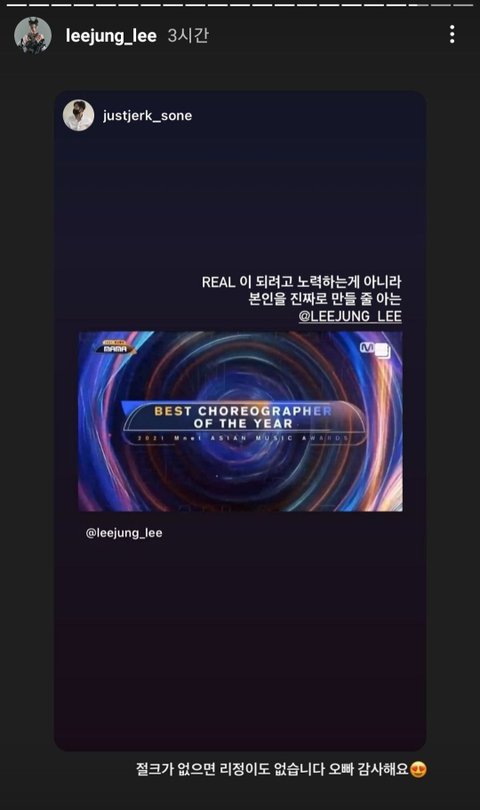 아래 인스타들이 리정이 스우파 끝나고 마마에서 베스트안무가상 받았을때 저스트절크 멤버들이 올렸던 인스타인데 아래처럼 리정 수상 축하글 줄줄이 올라옴ㅋㅋ