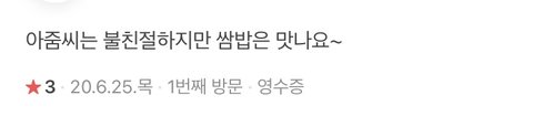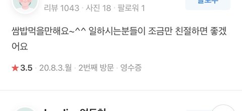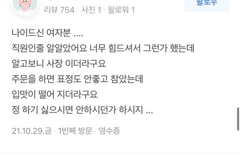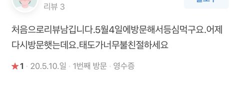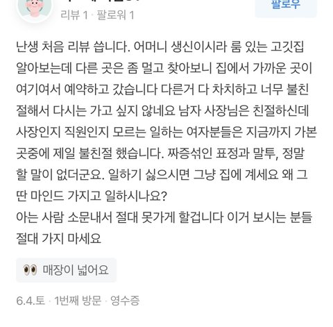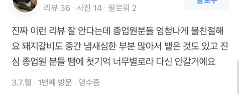 저희는 정말 똥밟은심정으로 이곳에서 이런 대우받고 식사를 도저히 못하겠어서 다른식당으로 자리를옮겼습니다 그 후 해당 식당 리뷰를 보았는데 그 여사장인지 직원분인지 그분한테 피해받은분들이 꽤 계시는것 같았습니다.
