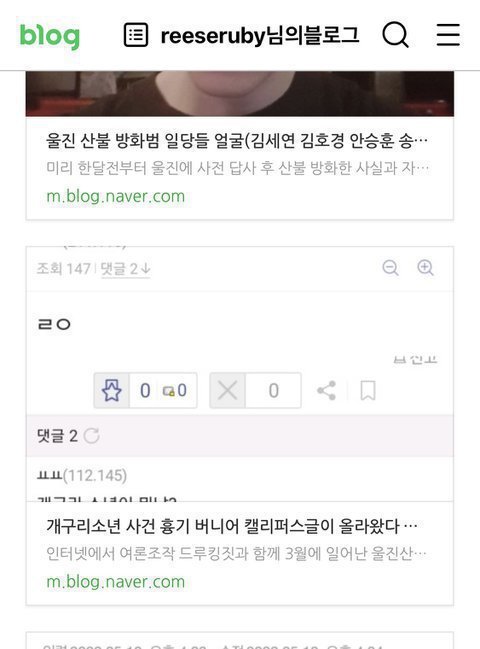 몇년간 민주당을 위해 여론조작과 청부업을 해온 성소수자 무리가(웹툰작가 겸 유튜버 레바,보배드림 취임식 수류탄 테러글 올린 수류탄남인 웹툰작가 박지 윤석열과 김건희 자택 테러글을 올리고 잡혀간 여장갤 고닉 설담, 이들과 함께 모든 일들을 기획한 유튜버 유우키의 일본이야기 포함) 사전선거 조작 및 부정선거를 덮기위한 시선끌기용으로 울진에 미리 한달전부터 사전 답사를 다니며 준비한 끝에 2022년 3월 4일 오전 11시 17분경에 일부러 산불 방화를 함(미리 사전 답사 후 방화를 했다는 자백, 드루킹짓 했다는 자백있음) 이들의 얼굴과 신상을 울진방화범 얼굴이라 올린 글을 최근들어 블로그 글을 내리라고 협박과 돈으로 매수하려는 시도를 계속해서 하더니 네이버뉴스 및 온갖 커뮤니티에서 조작 드루킹짓을 하는 무리답게 수백개의 아이디로 방화범들의 얼굴을 올린 글을 청소년 유해 게시물로 신고를 넣어 글을 내려버림 해당 증거들과 함께 울진산불 방화범들의 얼굴을 새로 글 파서 올렸으니 꼭 봐주세요 오랫동안 엑소와 방탄 팬코 악플러짓을하며 괴롭혀 오다 이번에 빅히트에 1500만원 벌금 고소당한 사람이 바로 울진 산불 방화범 얼굴글에서 첫번째 두번째 사진 속 사람임 배루킹무리 중 공범 한명이 5월 보배드림에 취임식 테러글을 올렸다가 잡혀간 후 해당사건으로 계속해서 나에게 저격을 받자 6월 1일 개구리소년 버니어 캘리퍼스 글을 올리고 취임식 테러사건 말고 개구리소년 사건에 관심을 가져달라고 요구함 하지만 이후 언론과 전문가들이 개구리소년 사건과 버니어캘리퍼스 글에 관심을 갖자 바로 글을 지우고 튐