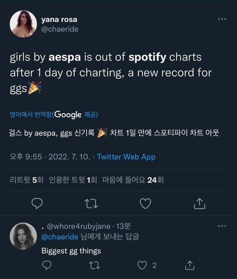 그래서 에스파만큼 제대로 인증받은 그룹 있기나 함? 신인상 인기상 동시에 받고 각 세대 원탑들만 받는다는 한대음 상도 받음 ㅋㅋ 그동안 음원 1위 제일 오래 유지한것도 4세대에서 에스파 넥레잖아 에스파보다 더 잘나간다고 할만한 그룹 없으면서 뭘 자꾸 내려침 ㅋㅋ