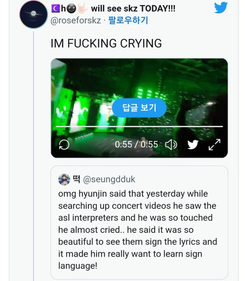 해석) 어제공연 영상을 찾아보다가 수어통역가님 영상 발견 너무 아름답고 감동적이라 울뻔했다 수어배우고싶다 영상에서 통역사님께 감사드리자 와~ 하는거도 있음