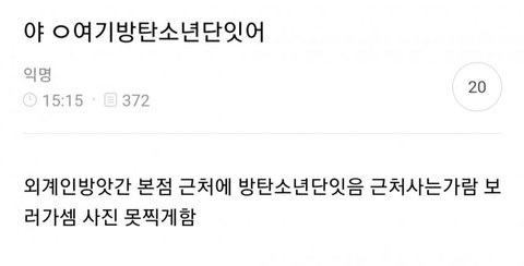 지금 논현에 있나봐 작성자는 제이홉만 봤다는데 주위사람들이 방탄 전체 다 있다고 했대 달방 찍나?? 아니면 호비 단독 예능 아님??