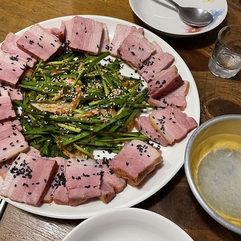 훈제삼겹에 부추무침 훈제삼겹 짠 거 알고있었는데 너무 짜서
