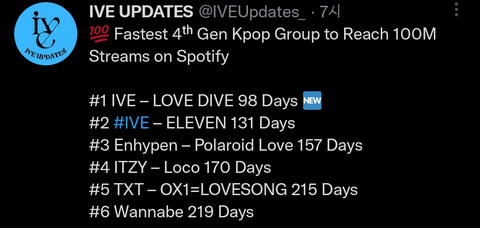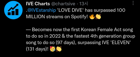 아이브 LOVE DIVE 스포티파이 1억 스트리밍 돌파