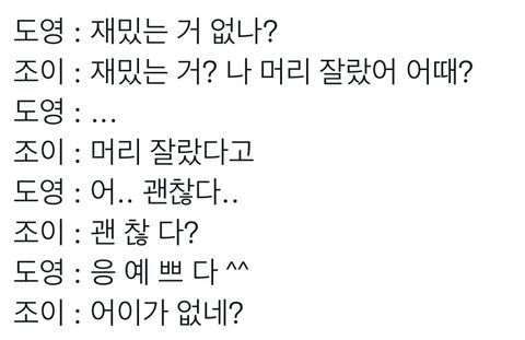 도영이 개드립 치면 조이 개질색하면서 미쳤나봐~ 하고 조이가 뭐 해달라고 하면 도영 응 아니야~ 응 안해~ 이러고 놀면서 서로를 보는 디폴트 표정이 친구야 왜 그러고 사니 바이브인게 웃김