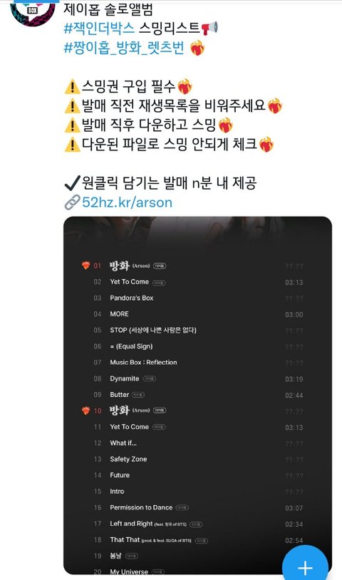 1번트랙부터 들을거야?? 물론 1시 땡하면 뮤비틀고 음원 다운후 스밍할건데 앨범 순서대로 들으면 좋다고 호비가 그래서ㅋㅋ 방화 바로 듣는걸 조금 참을까함ㅋㅋ