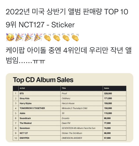 스티커 2022 미국 상반기 앨범 판매량 9위