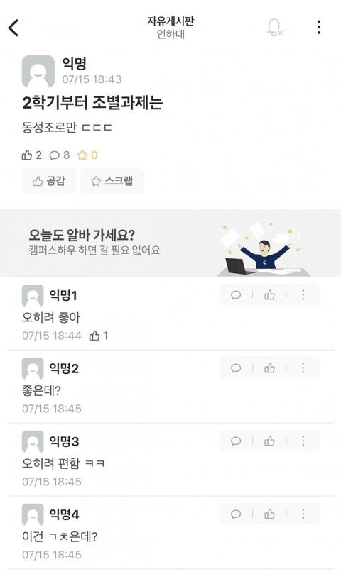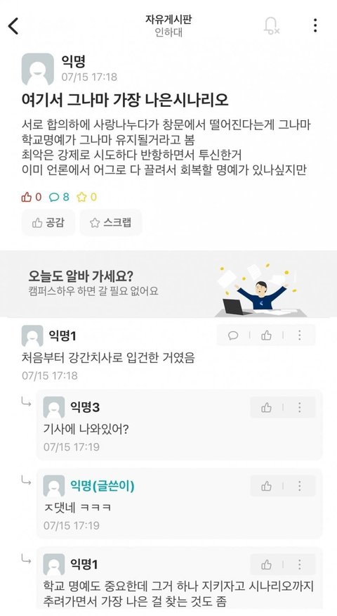 인하대생이고 계속 에타보고있는데 저런 어딜가나 있는 또라이들은 진짜 한둘입니다. 대부분의 학생들은 다 제쳐두고 고인을 위해 명복을 빌고 같이 아파하고 있습니다.. 자극적이고 문제가 될만한 글들만 악의적으로 캡쳐해서 '인하대에타상황'이라는 제목을 붙여 지금 당신들보다 몇배는 더 참담한 인하대 학우들을 욕받이로 만들지 말아주세요. .갓 20살된 저희 후배가 안타깝게 죽었습니다.화가나도 인하대생들이 더하고 슬퍼도 인하대생들이 더합니다. 제발 자극적인 글만 골라와서 갈등조장하려하지마세요. 어떤 반응을 노리고 쓴지는 알겠는데 이런글도 에타에 저런글쓰는 사람들만큼 보기 언짢습니다.갈라치기말고 추모에만 동참해주세요.