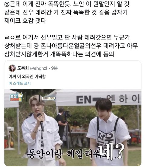 그래서 멤버들이 큐카드 보여달라고 했을 때도 끝까지 안 보여준 거임 이래놓고 자기가 외국 살다 와서 노안이랑 동안을 헷갈렸다고 함 ㅁㅊ 제이크 왤케 스윗하셔?