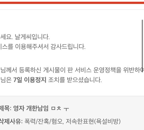 지가 아무잘못없는 글 보고 365일 정지때려서 저렇게 말한건데 삐져서 7일 또 때림 ㅅㅂ 나 벌써 두개나 정지먹음