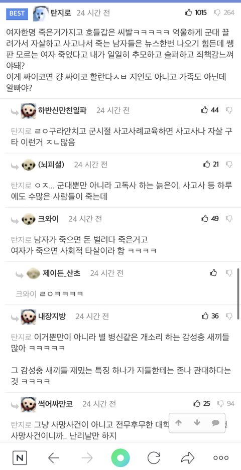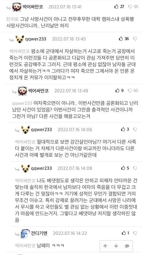 ㅋㅋㅋ나중에 군대에서 누가 억울하게 죽었다고 뉴스 기사나오면 여기서는 100% 이 사건 나온다. 무고한 희생자가 나오는건 둘 다 안됐지만 서로를 깎아내리기 위해서 이런 일을 들먹이는거 보면 진심으로 안타까워하는 사람은 양측 어디에도 없을듯.