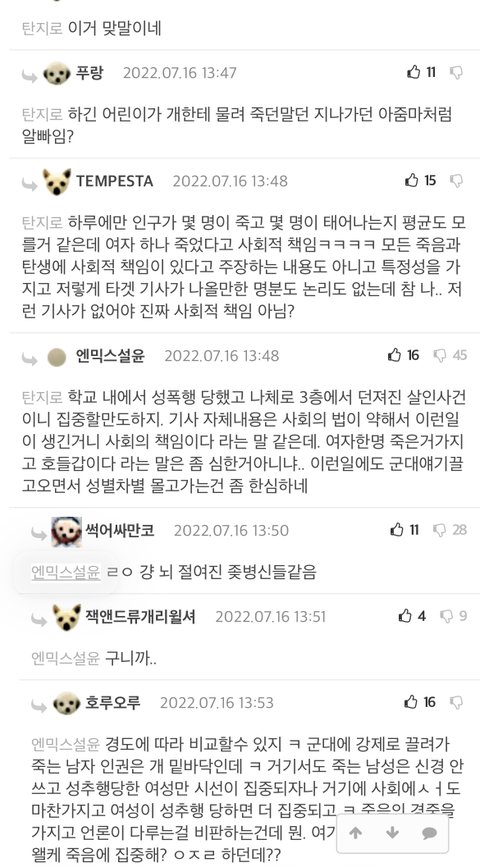 "여자 한명 죽은걸로 호들갑은 신발" 이라네요