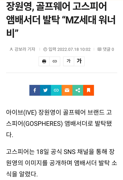 이젠 자회사니깐 찍었다고 발악을하네 ㅋㅋ 더 까줘라 ㅋㅋㅋ 느그들이 1주일전에 장원영 국적으로 뒤지게 깠더니 아이브 멤버들이랑 같이 V컬러링부터 해서 개인으로 골프웨어에 렌즈 모델 엠버서더까지 ㅋㅋ