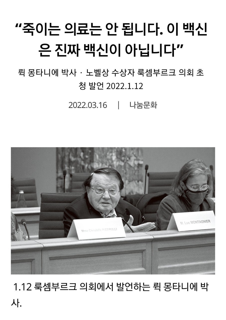 “죽이는 의료는 안 됩니다. 이 백신은 진짜 백신이 아닙니다” - 글로벌 평화나눔 1.12 룩셈부르크 의회에서 발언하는 뤽 몽타니에 박사. “프랑스는 20세기의 가장 위대한 과학자 중 한 사람을 잃었다” 에이즈 바이러스를 발견해 2008년 노벨의학상을 수상한 뤽 몽타니에 박사. 지난 2월 8일, 89세로 별세한 그는 팬데믹의 세계에서 가장 앞장서 명확한 입장을 밝힌 과학자였다.