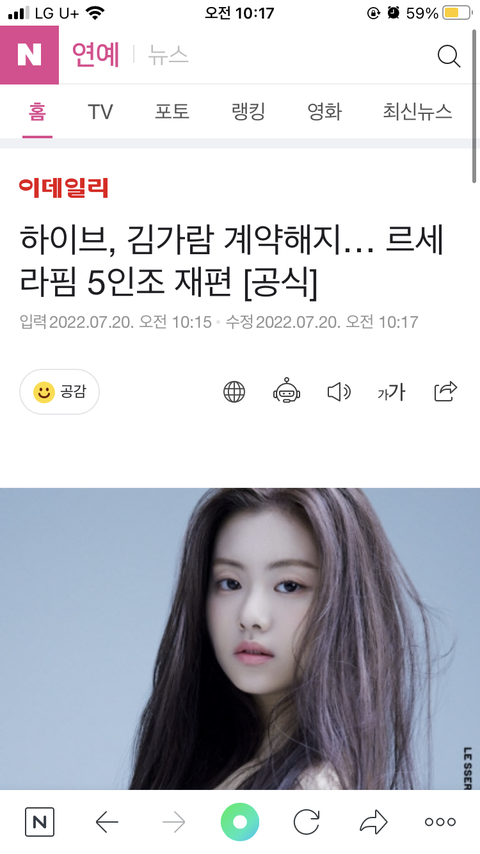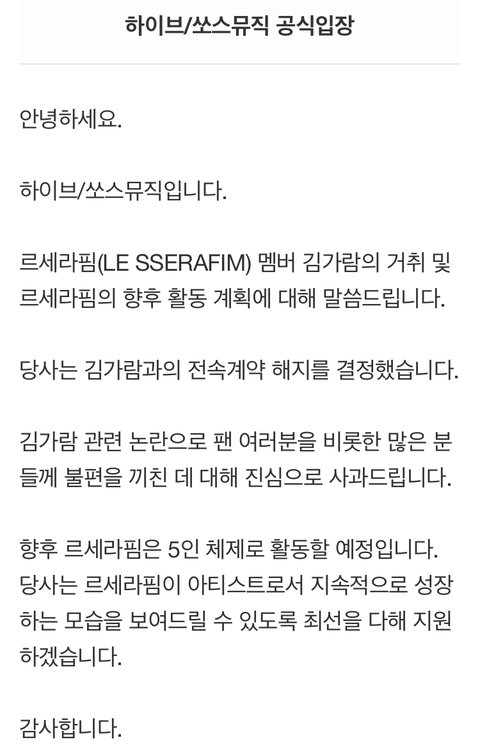 [공식] 하이브, 김가람 계약해지... 르세라핌 5인조 재편