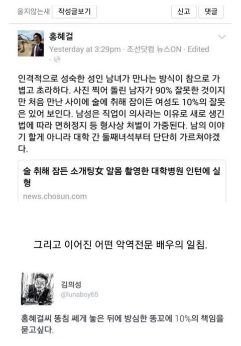 범죄가 10%있다는게 아니라 첨보는 남자랑 술취해서 잠들 상황을 만들지 말았어야 한다는 뜻이겠지. 나같으면 취하기전에 집에 갔다. 그정도 제어는 했어야한다 그런뜻이지 뭘 그리 쥐잡듯이 까대나~어찌보면 틀린말도 아니구먼