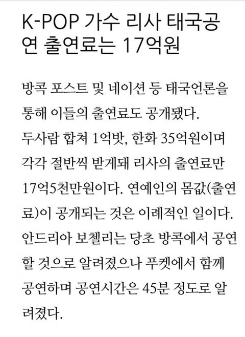 리사 태국 공연 출연료 17억이래