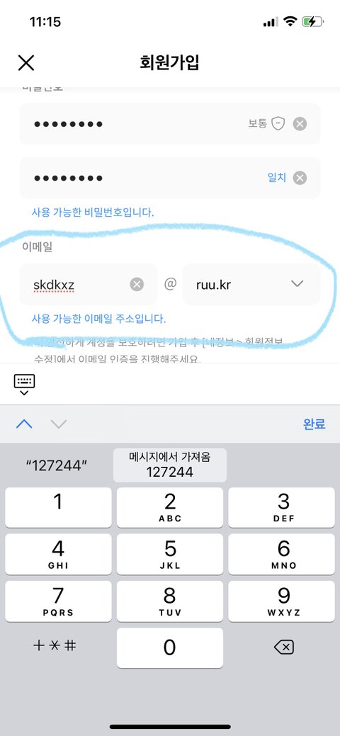 이렇게 이메일 넣는 칸 있거든? 그냥 아무 영어 넣고 이메일 주소는 “직접 입력” 선택 해서 ruu.kr라고 넣으면 돼! 굳이 실존하는 이메일 넣을 필요 없어
