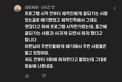 예고편에 민기는 왜 없냐? = 민기도 퇴소했다. = 왜? = 이현이 퇴소해서 굳이 이 프로그램 할 이유가 없음. 이라고 생각해서 자진 퇴소하지 않았을까?