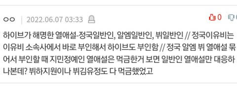 알엠 열애설에 대응하면서 오만 말 다 듣고 있던 뷔 열애설에 대응 안한것만 봐도 찐이야..