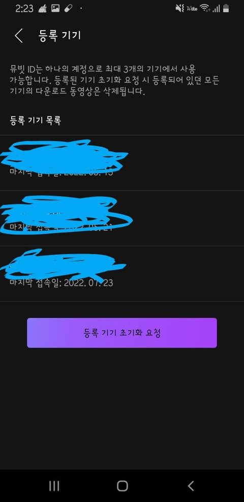 우선 뮤빗 로그인된 계정에 등록기기가 2~3개로 되어있는지 확인해줘
