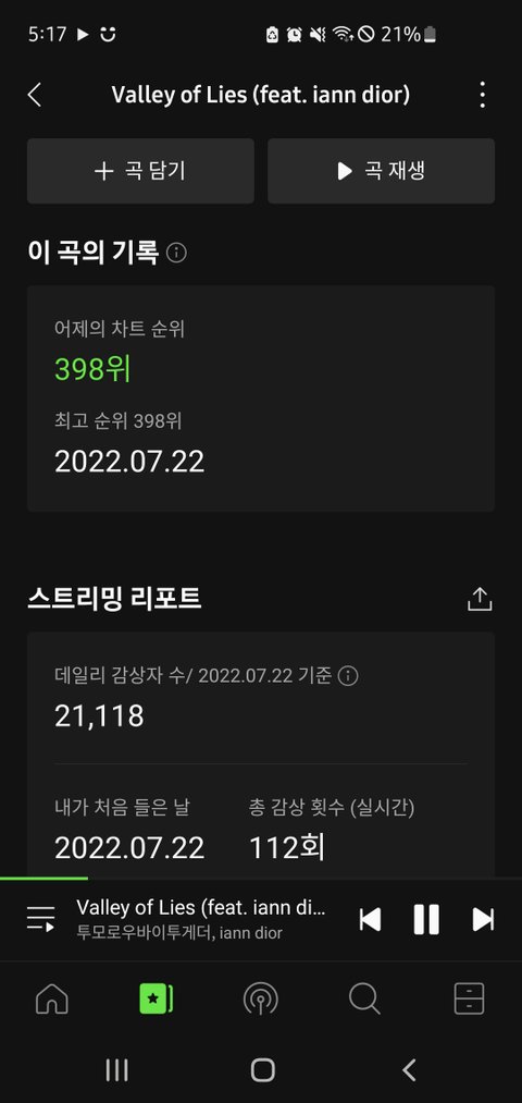 첫 콜라보곡 어제 398위!! 첫날 900위대였는데 많이 올랐당