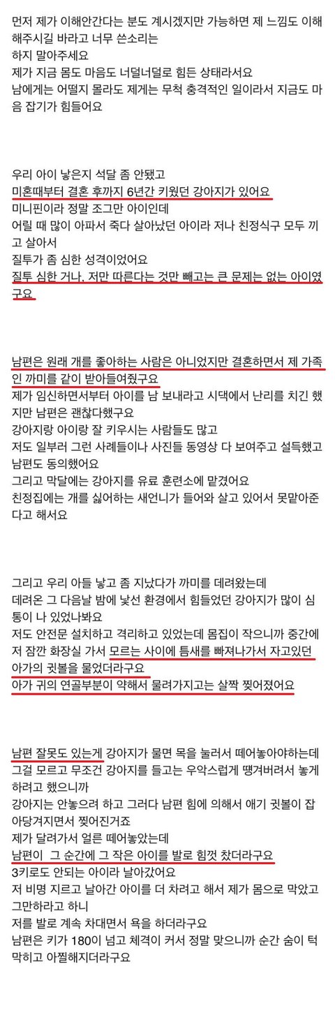 예전에 돌 된 아이가 집에서 키우던 개한테 물려서 세상 떠났다는 기사를 봤어요. 하물며 저 글 아기는 아직 신생아인 것 같은데 그 어린 아기를 개가 무는 모습을 본 부모 중에 눈 돌아가지 않는 사람이 있을까요? 개를 막아서는 부인을 때린 건 잘못이지만 '이 상황에서도 개 편을 드나?'싶은 생각에 분노를 멈출 수 없었던 것 같다는 생각도 들어요.